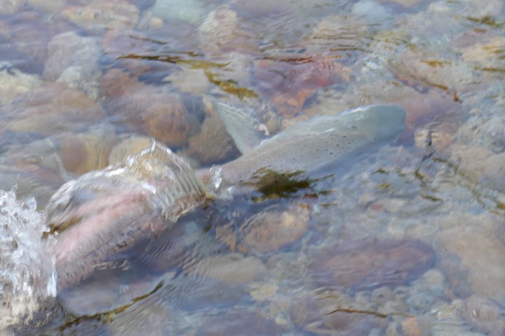 Bij het dorpje Valemount kunnen we de zalmen bewonderen op het einde van hun reis van 8000 km. Hier worden de eieren gelegd en dat is dan ook gelijk het einde van pappa en mamma zalm en begint de kringloop opnieuw.