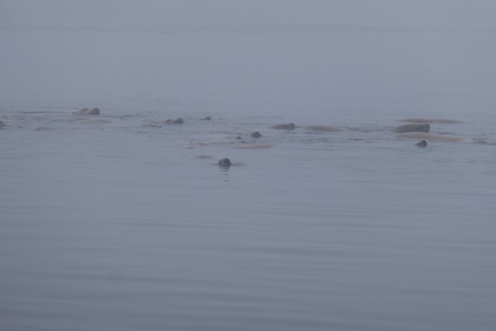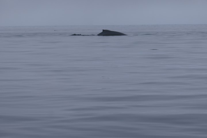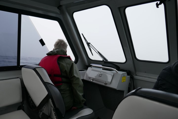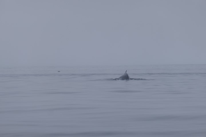 We hebben een prive tour met een kleine boot. Dat is geweldig we varen met de boor richting de vogels en hopen dat daar walvissen zijn. We zetten de boot uit en in de complete stilte luiteren of we walvissen horen. Dat doen we.... We horen ze vlakbij blazen en geluid maken, maar we kunnen ze door de mist niet zien.