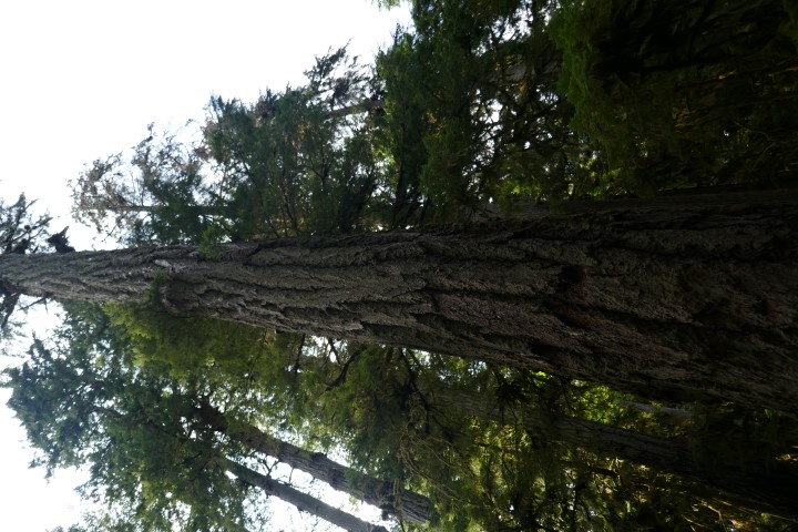 Hier bij Cathedral Grove staan vele oude rode ceders en het is inderdaad indrukwekkend hoe breed, hoog en kaarsrecht deze bomen zijn. Net als de kauri in Nieuw-Zeeland werden deze ook veel voor de scheepsbouw gebruikt.