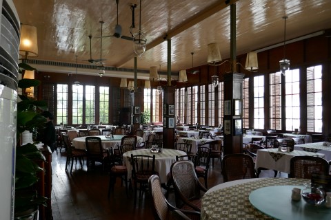 We gaan daarom nog maar even lekker koffie drinken met wat fruit in het luxe Batavia restaurant. Dit is het huis van de toenmalige gouverneur. Erg kolonistische stijl...