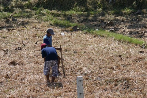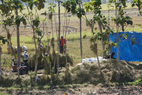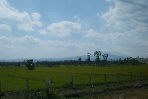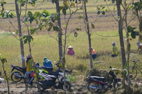 We rijden ook door uitgestrekte rijstvelden waar nu wel mensen aan het werk zijn.