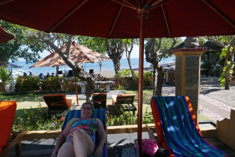 Vandaag hebben we een vrije dag. We zien alleen maar de ligstoelen van het hotel.