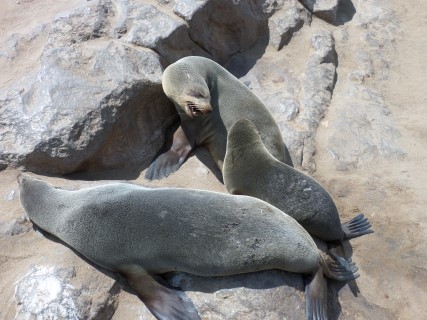 We vertrekken weer uit de lodge in Swakopmund en gaan eerst de zeehondenkolonie in Cape Cross bekijken. Het is wel 100 km omrijden.