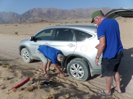 En ja hoor we nemen op advies van de receptie een ander weggetje en dat levert onze eerste en hopelijke tevens laatste lekke band op deze vakantie.