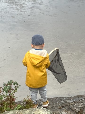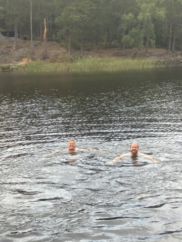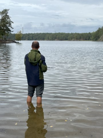 Hoer kun je zwemmen en vissen. Miek ligt er al snel in ondanks de 18 graden watertemperatuur.